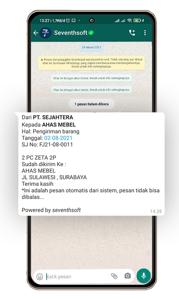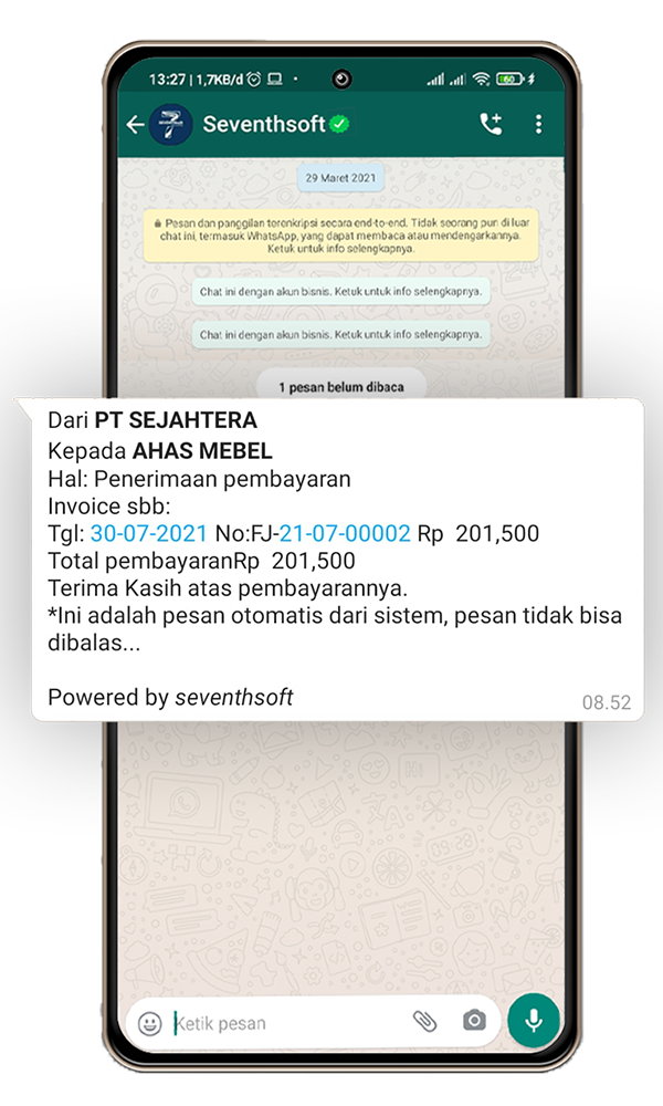 Seventhsoft Business One Mengintegrasikan Aplikasi Accounting Marketplace, E-order (pesanan online), dan WhatsApp Notifikasi dalam 1 aplikasi.